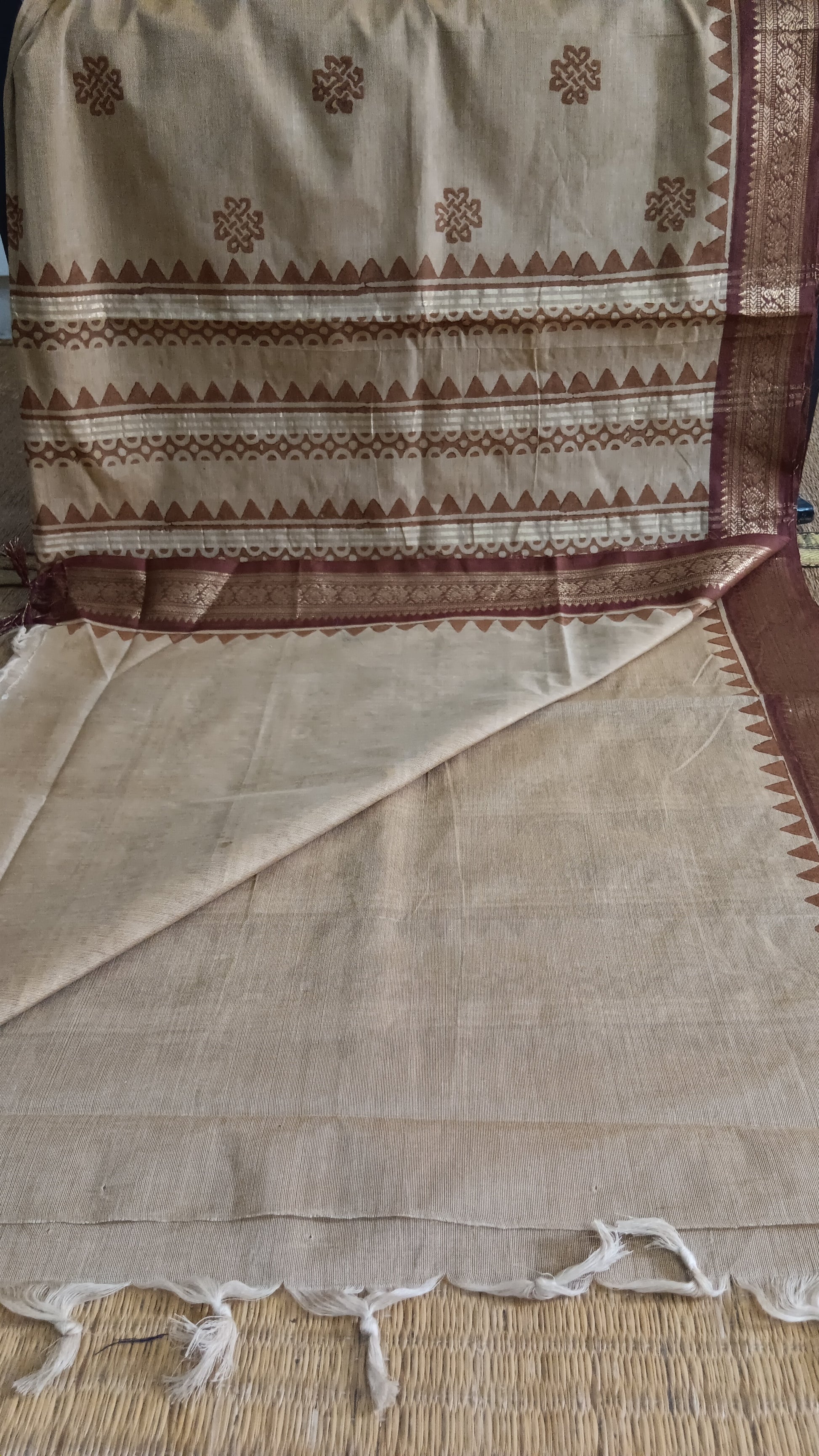 Beige cotton saree with zari border from Tamil Nadu. Hand block printed in Chennai by an artisan with decades of experience. The saree was woven on a powerloom. This saree is ideal for functions.