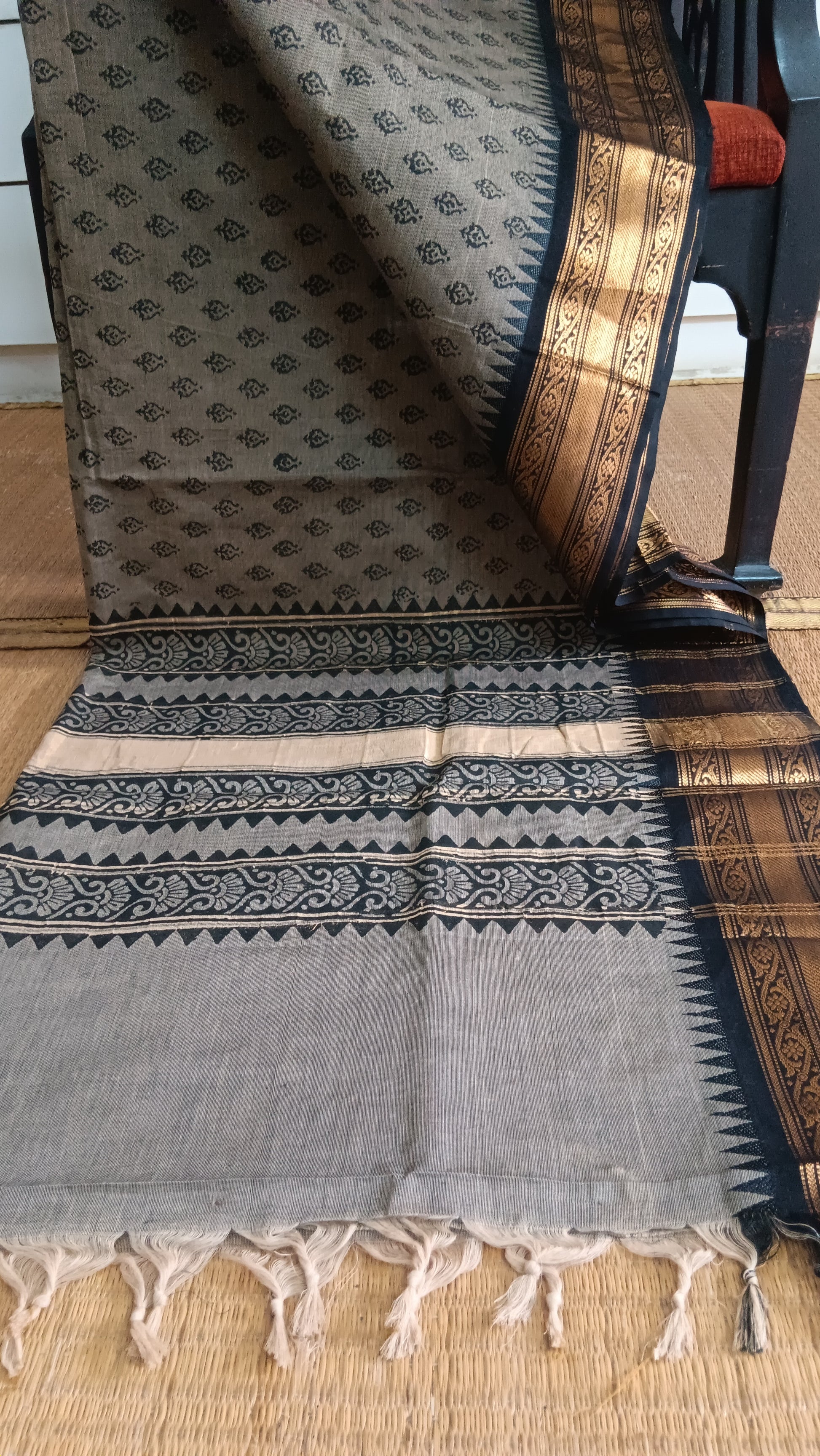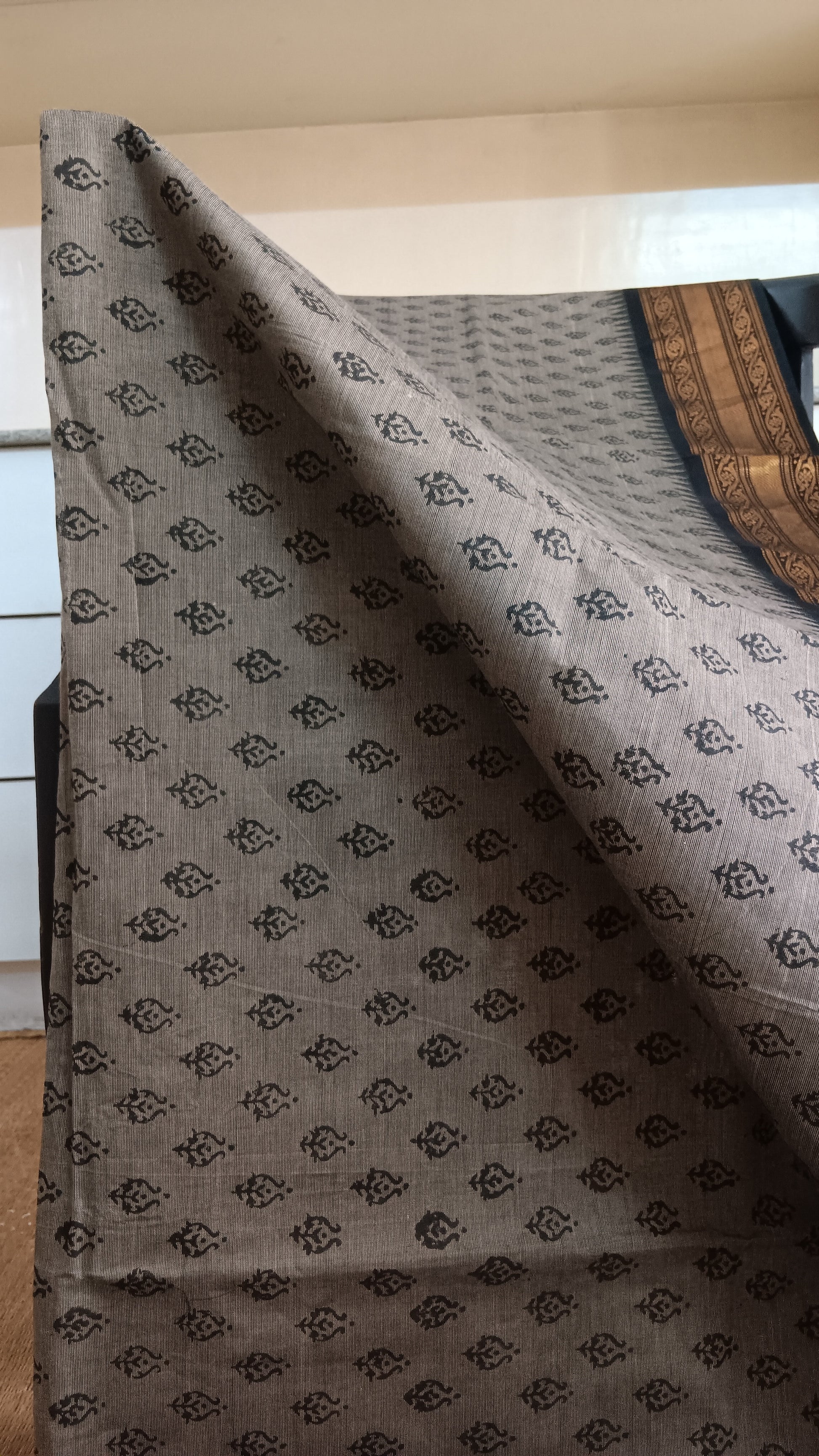 Elevate your function wear with this stunning slate grey cotton saree, where traditional craftsmanship meets contemporary elegance. Hand block printed with meticulous detail, this piece features a striking black and gold zari border that adds a touch of opulence without overwhelming the design. The soft cotton fabric ensures comfort throughout your event, while the sophisticated color palette makes it versatile enough to pair with various jewelry and styling choices. Perfect for weddings, celebrations, and special occasions, this saree combines timeless artistry with wearable luxury. A wardrobe essential that celebrates Indian textile heritage with understated grace.