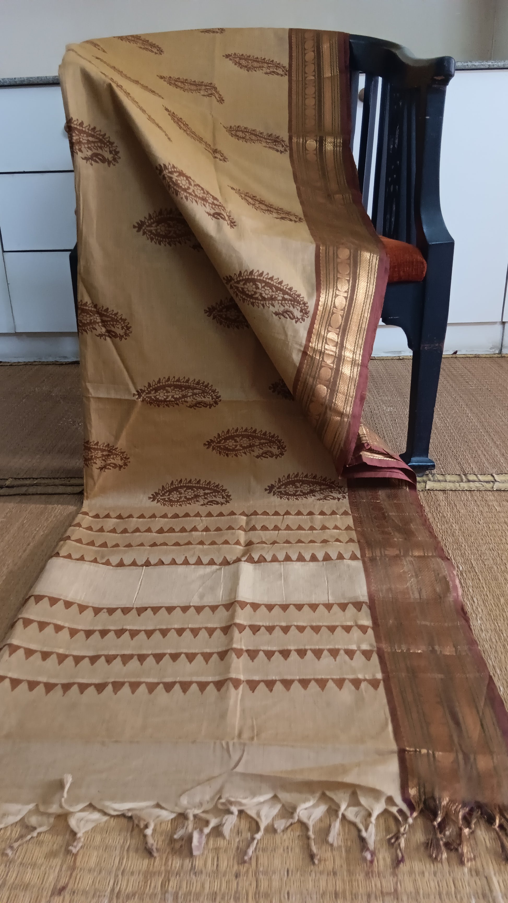 Celebrate tradition with this beautiful beige cotton saree from Tamil Nadu's celebrated weaving region. Woven on a power loom, it showcases exquisite hand block printed mango motifs that dance gracefully across the body—a nod to classic South Indian design heritage. The elegant zari border adds a touch of refinement that elevates the entire piece without overwhelming its understated charm. Perfect for functions and special occasions, this saree offers the ideal balance of comfort and sophistication. Invest in a timeless piece that honors authentic craftsmanship while keeping you effortlessly elegant.