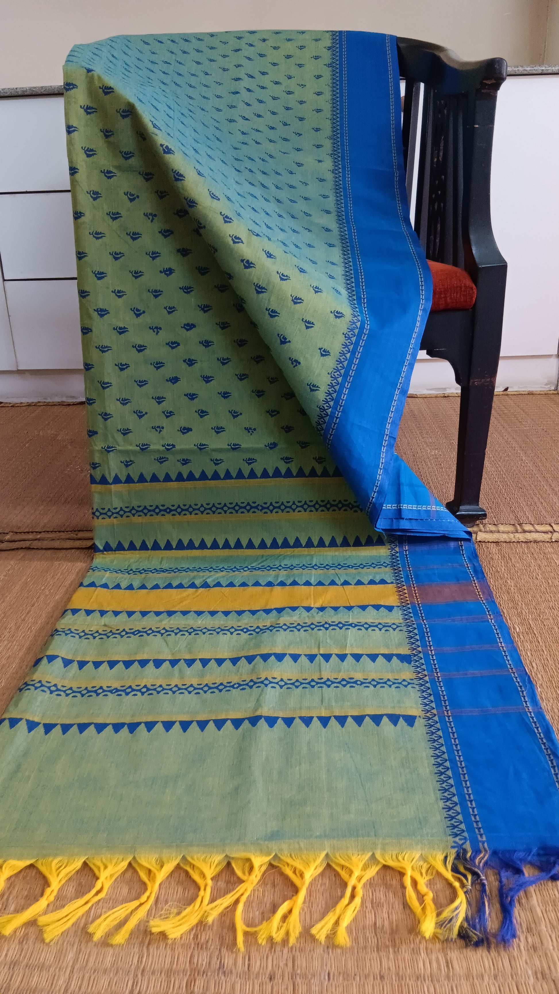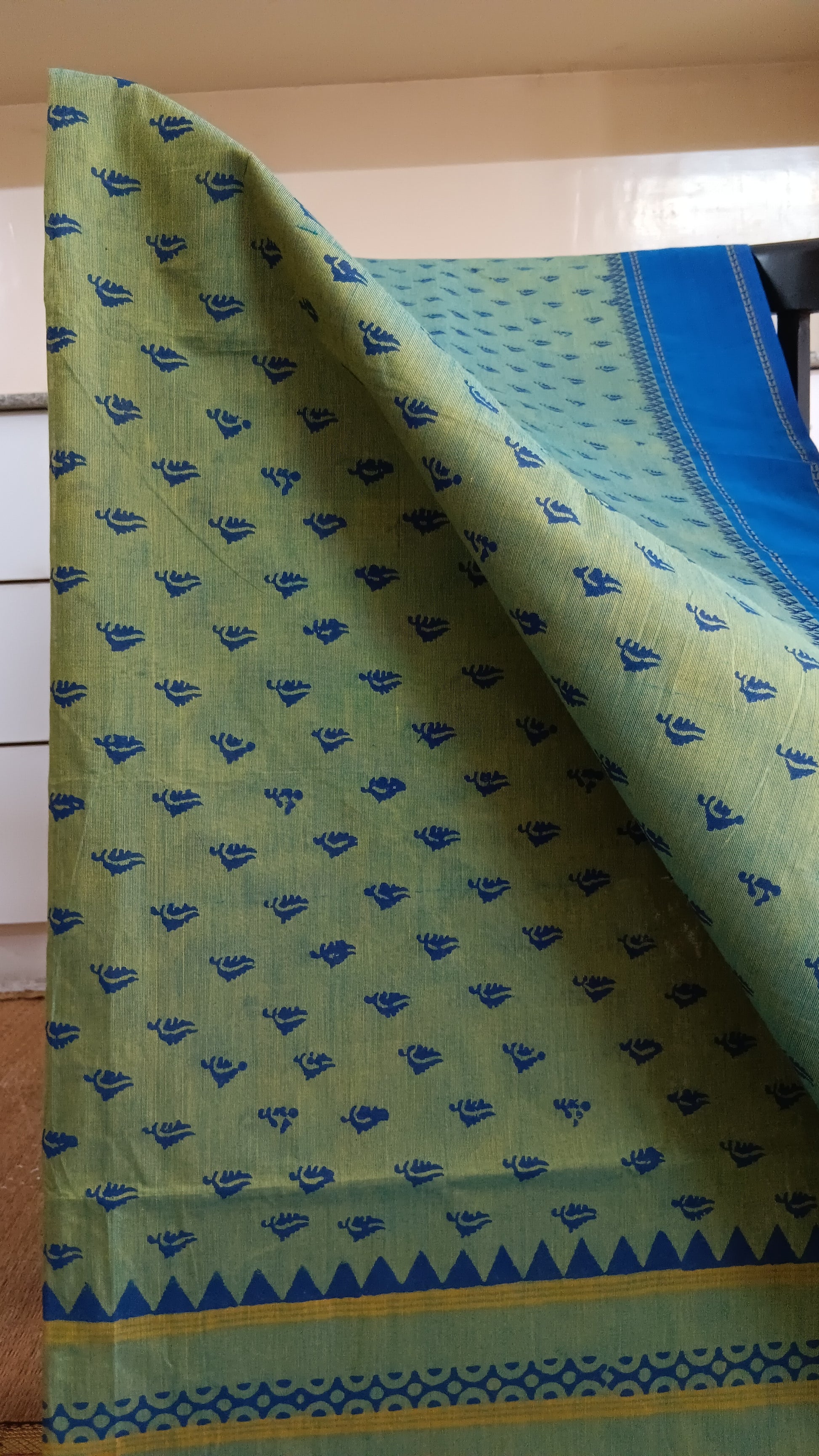 Discover timeless sophistication in this serene blue cotton saree, expertly crafted on power looms in Tamil Nadu's renowned textile region. The hand block printed design infuses each piece with authentic artisanal character, creating a unique pattern that stands out from mass-produced alternatives. Lightweight and breathable cotton makes it ideal for daily wear, whether you're navigating a busy workday or enjoying casual outings. The understated blue tone complements any complexion and pairs beautifully with minimal jewelry, letting the saree's natural elegance take center stage. Durable yet comfortable, this everyday essential proves that quality craftsmanship and practicality go hand in hand. Make this versatile staple your go-to choice for effortless, polished style.