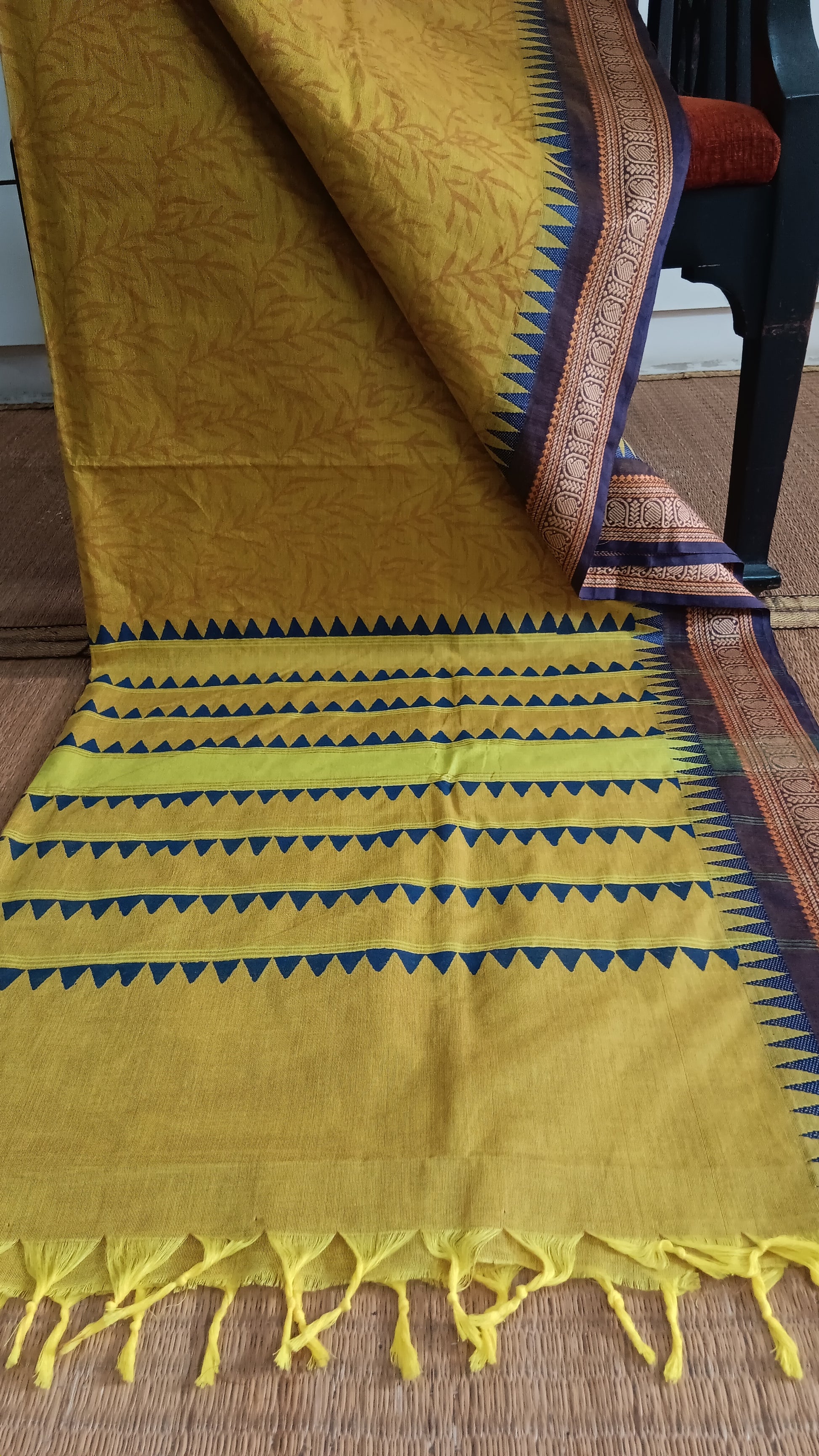 Brighten your workday with this cheerful yellow cotton saree, thoughtfully designed for the modern professional. Woven on power looms in Tamil Nadu, this piece combines traditional craftsmanship with practical everyday wear. The hand block printed details add character and depth, while the classic thread border provides a polished finish. Soft, breathable cotton ensures comfort during long office hours, and the vibrant yellow hue pairs effortlessly with neutral accessories for a refined, put-together look. Whether you're heading to meetings or client presentations, this saree strikes the perfect balance between professional sophistication and relaxed elegance. Invest in a versatile piece that works as hard as you do.